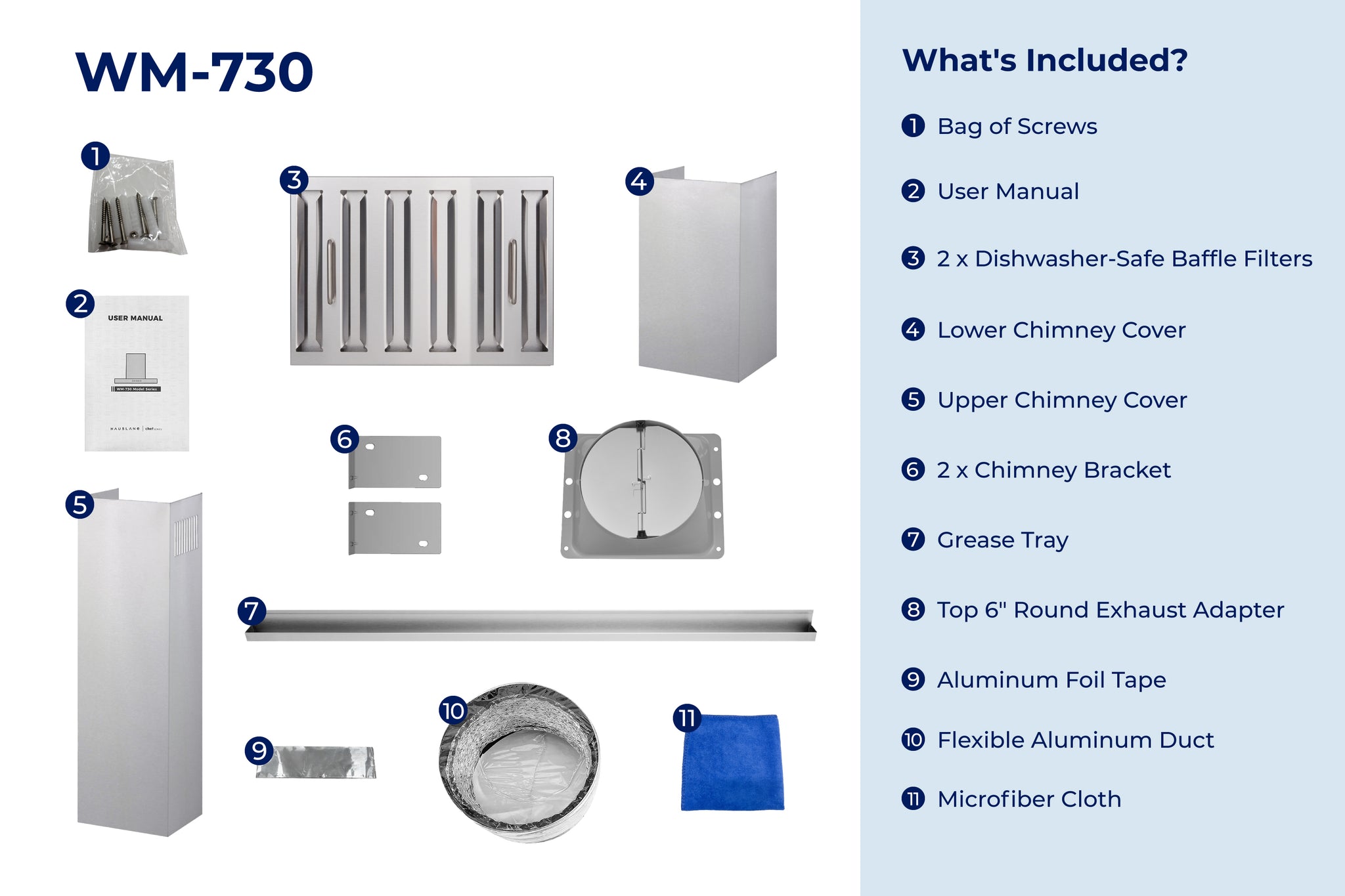 The WM-730 will effortlessly enhance the aesthetic of any kitchen. Whether you have a traditional or modern kitchen decor, this range hood’s contemporary design seamlessly blends in and adds a touch of sophistication to your culinary haven.